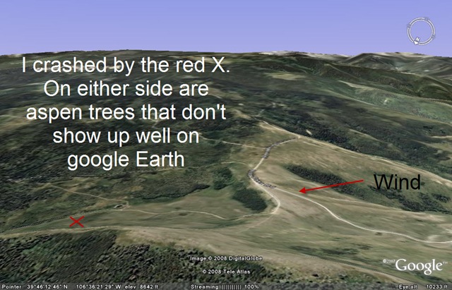 So, I made one big drifting circle as a down-wind leg and base leg to get as far back from the cliff as I could.. My Final approach was going way better than expected till a big right bump…corrected it, and immediately afterwards the bottom fell out. I remember pulling the bar in and having that feeling only a good roller coaster gives your stomach as it rounds the top of a rise. I think my legs were out. I don’t remember the rest. Memory starts back up later when a hiker arrived and I’m taking battons out. He had see the whole thing from somewhere along the ridge.