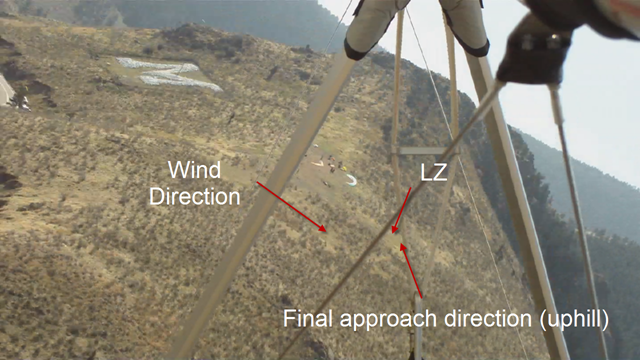 Below is a video of the top landing on Saturday….note though, on this one I didn’t take this advice so much, but got away with it. You can see my carabiner (weight) move way over to the right as I’m stalling to keep that uphill (right) wing down!