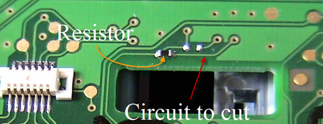 6. The resistor is easy to remove. Takes very little heat, or you can just yank it off (or crush it). Replacing it with a blob of solder is actually easier than bridging a cut with solder, because of the solder mask.