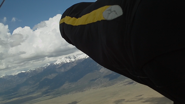 Monday brought a little drier conditions and an opportunity to bring out my Atos. The above picture shows cloudbase around 13.2, super low for typical Sangre flying. Also untypical for me was a flight that was entirely over the San Luis Valley instead of against the Sangre De Christo’s. It was fantastic cloud flying! EPIC doesn’t do it justice. Getting off the hill was tricky. Waited for some sunlight to come, walked to launch in a crosswind and waited for something to change. Eventually, a thermal block created no-wind, and then a skosch of a puff up the face. I took it and headed N to where I thought the thermal was and sure enough, it worked till I lost it. I headed out to a cloud in the valley and spent the next 30 minutes low trying to stay off the ground and find something that would get me up to the clouds. After many disappointing climbs to just 10k, a boomer got me to the white room and 13k.