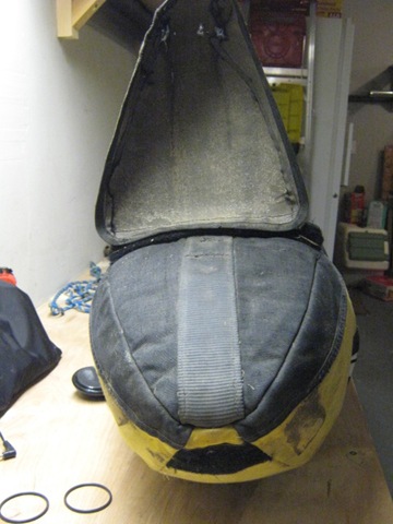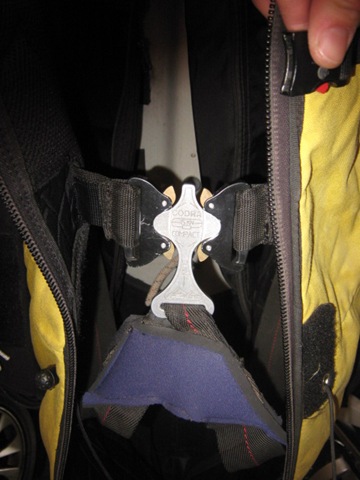 Above shows the truck tow and aerotow loops.  I’m holding open the camelback pouch, and the plastic boot thing is in view.  It’s great for storage of harness bags and glider pads/bags.