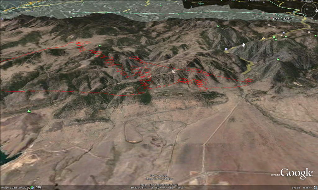 Once over Coal Creek I struggled low in an 8-11mph NE wind for a while. I’d been pushing upwind in a significant blue hole and the air felt more and more subsident so opted to call it a success and turn back to Golden. Continuing into the headwind low would put me in air coming from less likely thermal generating territory (heavily tree’d up wind), less favorable ridge facing direction for wind deflection up, and the rising ground to the N meant NE wind coming downhill would be a little extra sinky. 2 out of 3 upwind trips this direction have skunked me this way.